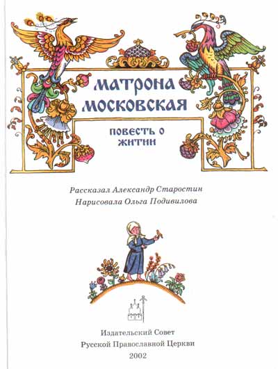 ББК 86-372 М34 По благословению Святейшего Патриарха Московского и всея Руси АЛЕКСИЯ II М 34 Матрона Московская. Повесть о житии. - М.: Издательский Совет Русской Православной Церкви, 2002. Краткая повесть об одной из самых почитаемых в Москве святых — блаженной Матроне (прославлена Русской Православной Церковью в лике святых 2 мая 1999 г.) — ясно, светло и с любовью доносит до нас образ того, как “сила Божия в немощи свершается”, как маленькая, беспомощная, от рождения слепая женщина силой Божией благодати обрела великую духовную прозорливость и обратила, и доныне продолжает обращать ко Христу тысячи людей. Святая блаженная Матрона в этой радостной о Христе книге предстает перед нами как “самый счастливый человек своего времени” и учит нас, что истинное счастье — единение с Богом. Для младшего и среднего школьного возраста. (с) Издательский Совет Русской Православной Церкви, 2002 г. (с) А. В. Старостин: текст, 2002 г. (с) О.В.Подивилова: иллюстрации, 2002 г. |
